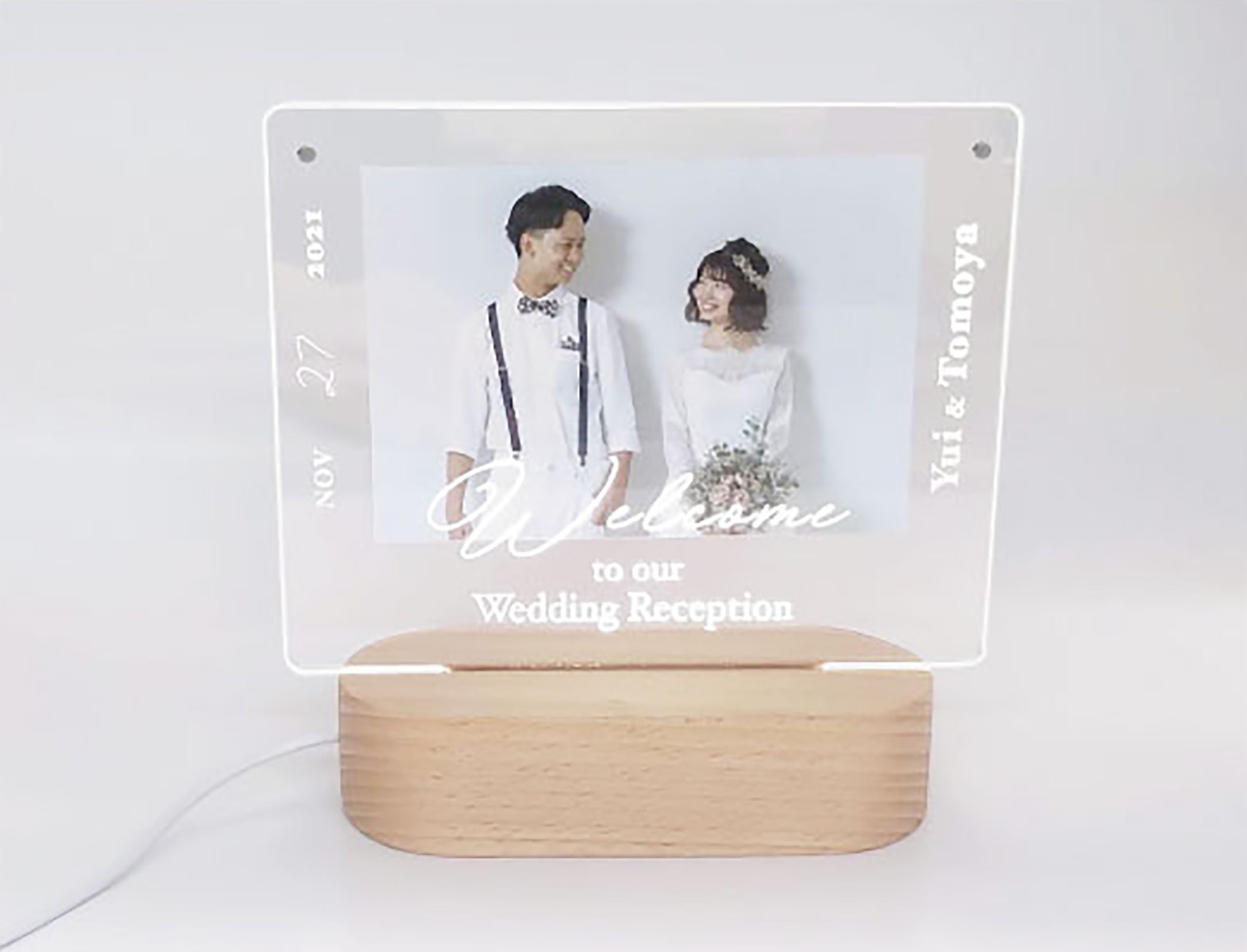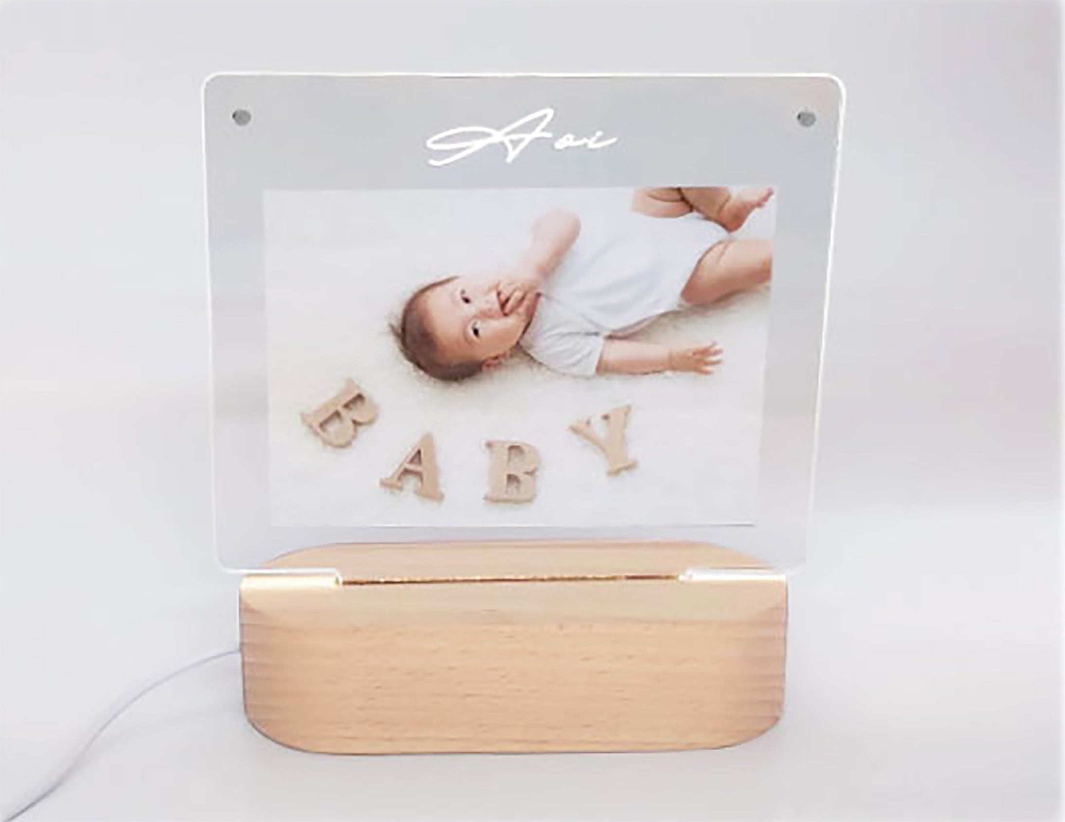 電源を入れるとアクリルの側面と文字が優しく光り思い出を明るく照らします。