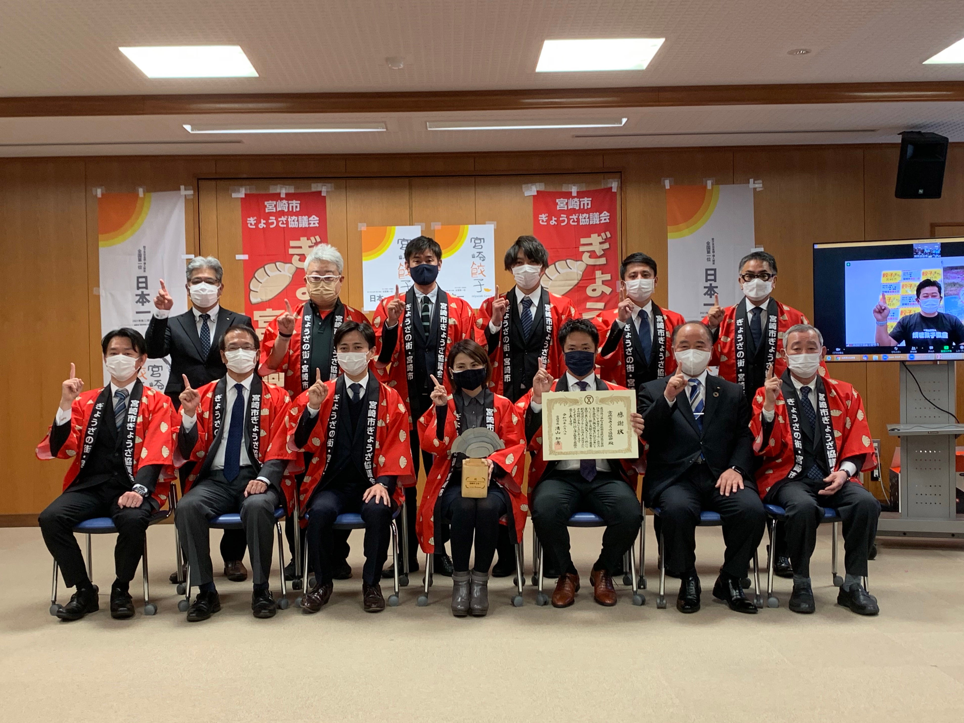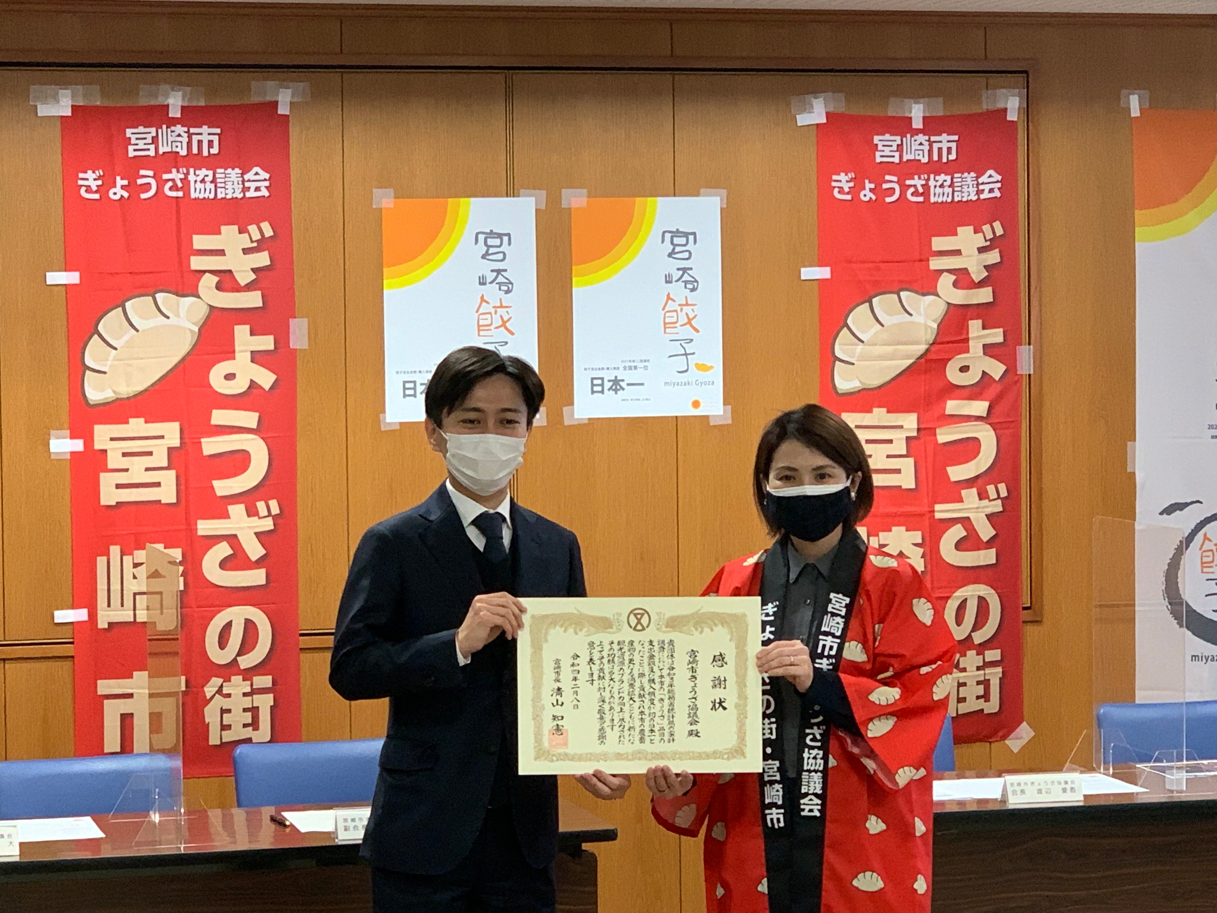 「念願の日本一、本当におめでとうございます。2020年は3位と、みやざき餃子大使として残念でした。2021年、日本一美味しい宮崎餃子が名実ともに日本一になったことはまことに喜ばしく、宮崎の皆様、本当におめでとうございます。先日、私は宮崎市特別栄誉賞を授与いただきました。これまでにも増して宮崎の餃子、宮崎の観光を全国の皆様へPRしてまいります」