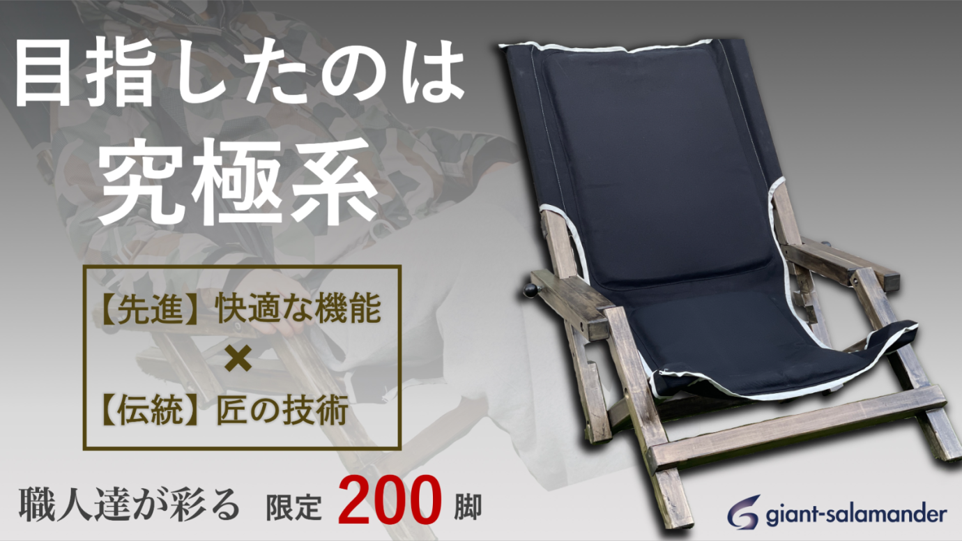 岐阜発祥のアウトドアブランド「giant-salamander」を運営する、株式会社PUZZLCE(所在地:岐阜県岐阜市、代表:小池恭平 https://puzzlce.com/)は、家具職人が造る特殊ウッドフレーム、老舗縫製工場が造る低反発ウレタンシートを掛け合わせた、リクライニングチェアをクラウドファンディングサイトにて先行販売を開始しました。