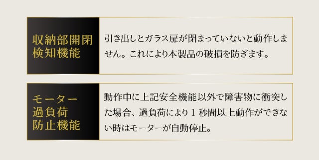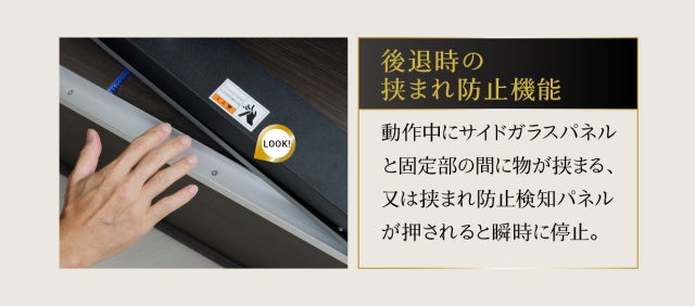 の挟まれ防止機能」、「収納部開閉検知機能」、「モーター過負荷防止機能」を搭載しております。