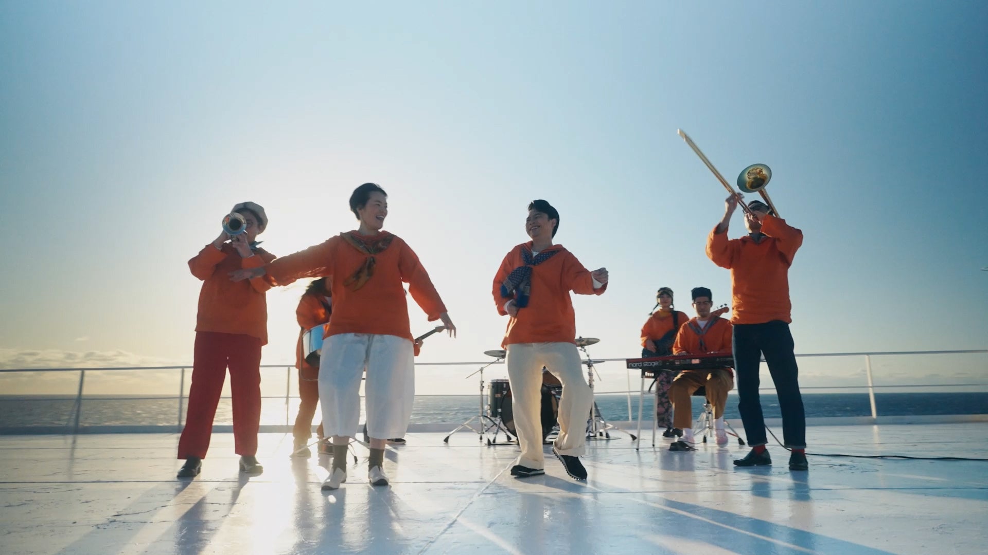 新船オリジナルテーマソングの楽曲制作メンバー、二階堂和美、浜野謙太(在日ファンク)、サイトウ”JxJx”ジュン(YOUR SONG IS GOOD)、MC.sirafu(片想い)、ジェントル久保田(在日ファンク)、村上基(在日ファンク)に加え、MVでは新たに福富優樹(Homecomings)、福田穂那美(Homecomings)、村野瑞樹(なつやすみバンド)のフレッシュなメンバーが「PACIFIC ORANGE BAND」として出演!