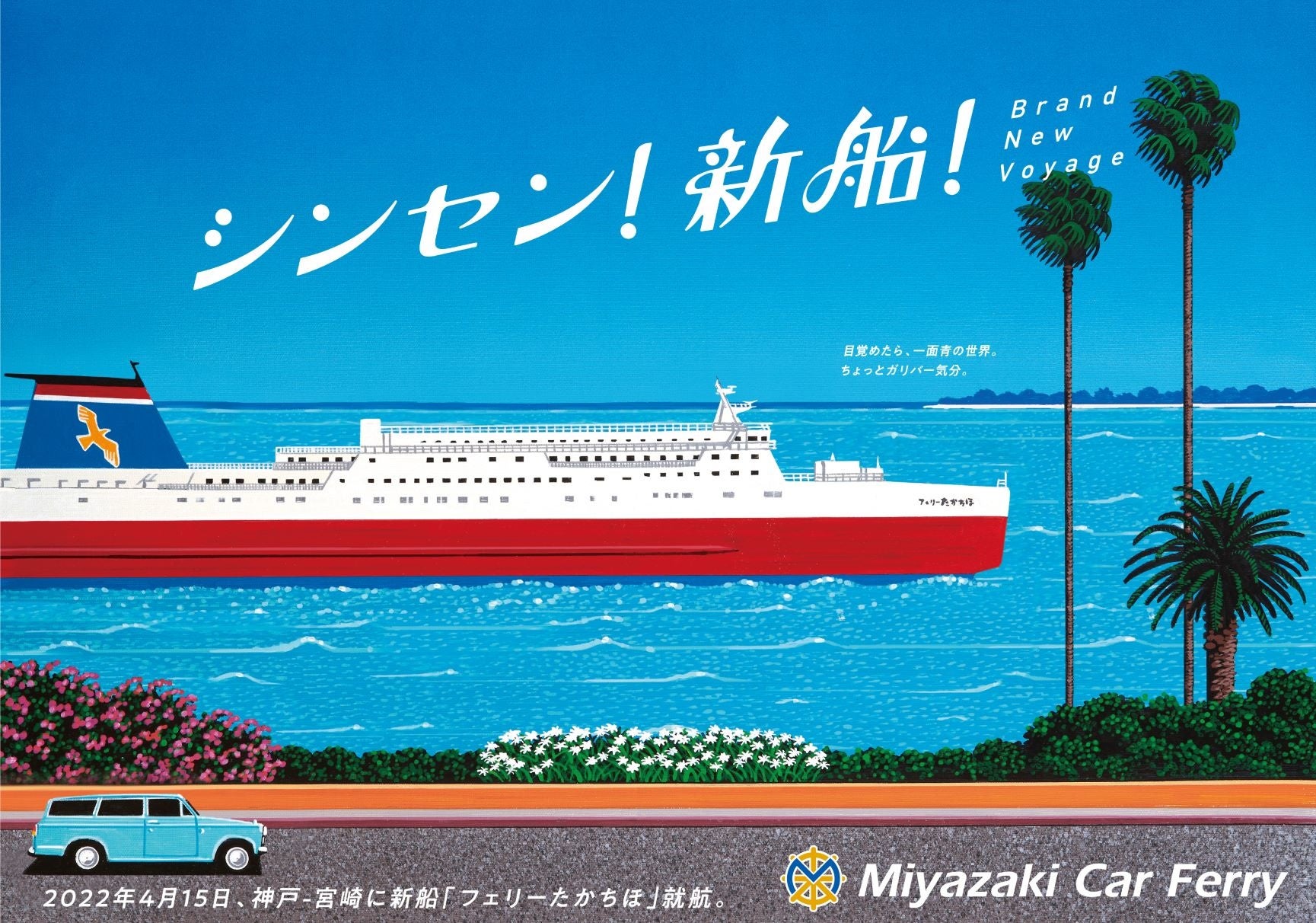 『A LONG VACATION』(CBS・ソニー出版)のイラストで知られるイラストレーター永井博が、新船「フェリーたかちほ」のオリジナルイラストを描き下ろし、新船オリジナルテーマソング「Blue Magic」のMVをはじめ、WEBサイト、ポスター、新聞広告、交通広告、ノベルティなどに展開しています。永井博の独特な世界観と宮崎の風景やフェリーがマッチした、リゾート感あふれるオリジナルイラストをぜひご覧ください。