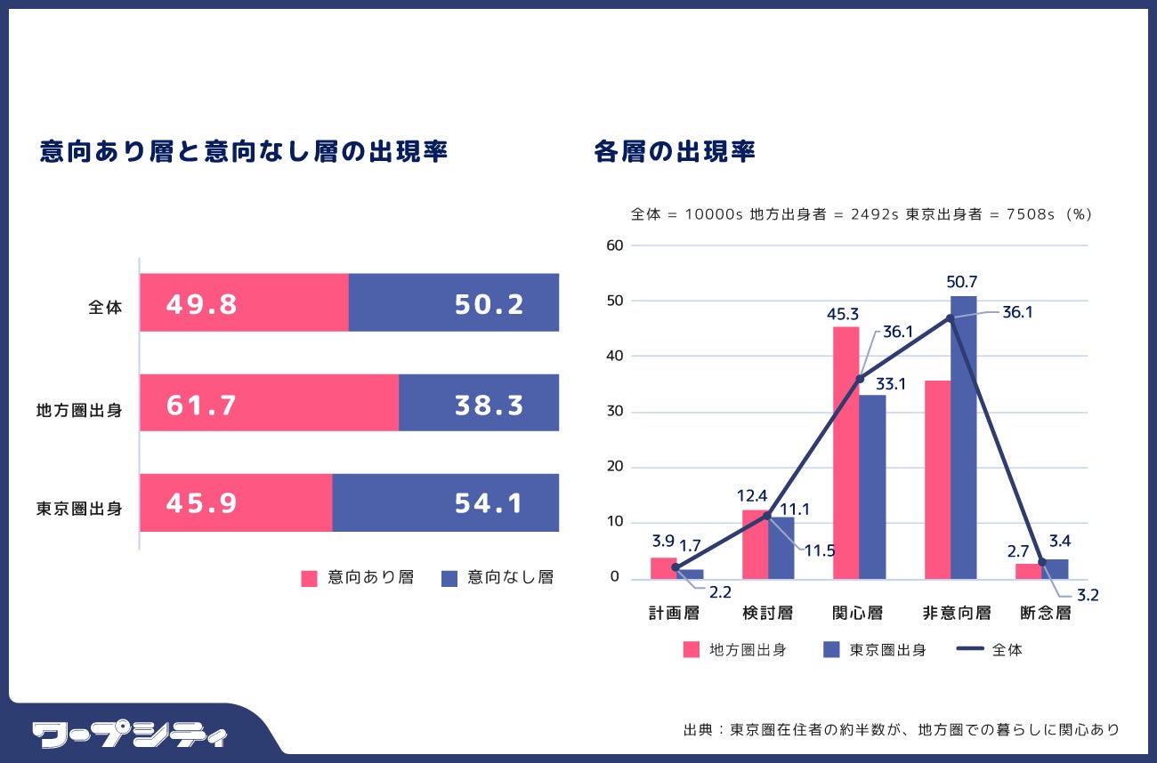 東京圏在住者の「東京圏以外の地方暮らし」の意識・行動を把握するためのWEBアンケート調査(内閣官房まち・ひと・しごと創生本部事務局が2020年実施)によると、 東京圏在住者(20~59歳)の49.8%が「地方暮らし」に関心を持っていること、地方圏出身者の方が東京圏出身者よりも関心が高いこと、全体的に若者の方が地方移住に関心を持っていることが分かりました。