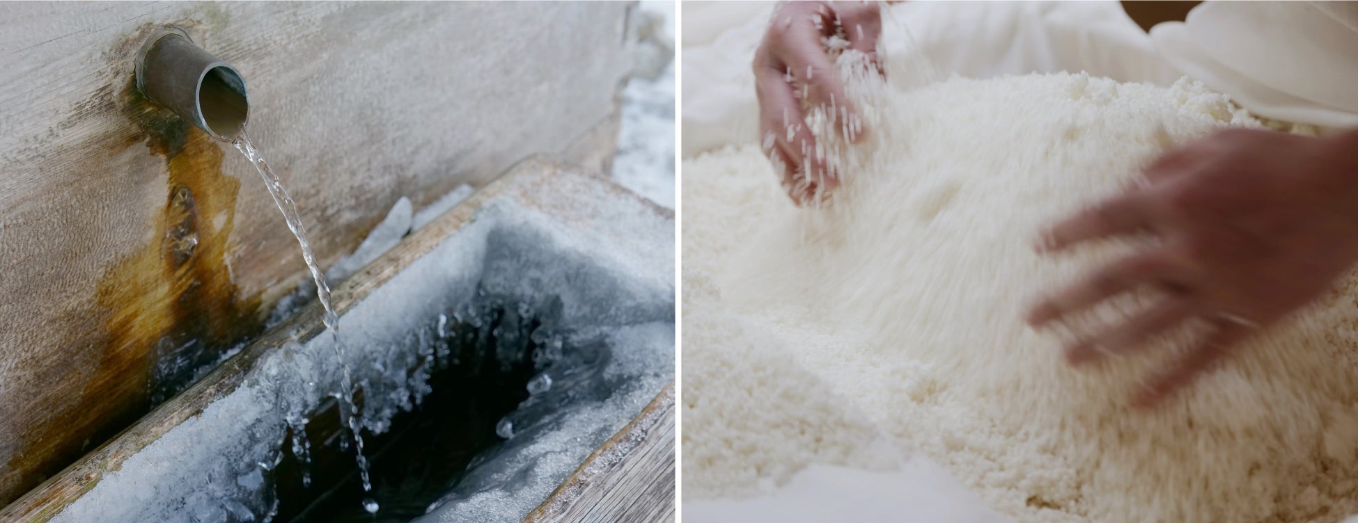 左:山の水が凍る風景は奈良井の冬を感じさせる 右:安曇野産の酒米で作られる麹