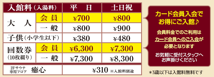 ・設備 :大浴場・露天風呂・あかすり・お食事処・ゲームコーナー・足湯