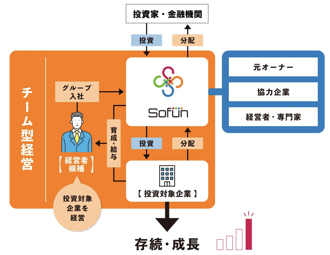 SoFun株式会社は「中小企業が再び輝く社会を作り、日本をおもしろくする。」をビジョンとして、若手経営者の発掘と事業承継型投資(マジョリティ投資)を行うことにより、幅広い企業に「家業から事業への変革」による再成長の機会を提供しています。