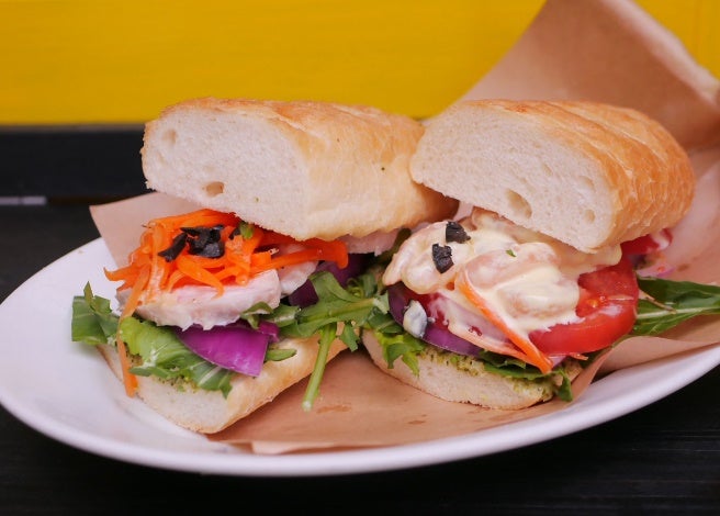 具材:塩麹バケット、有機野菜で使ったベジタブルペースト、ルッコラ&セルバチコ、低温調理した美桜鶏胸肉のハム、有機キャロットラペ、有機アーリーレッドオニオン,有機ブレンドハーブオイルなど