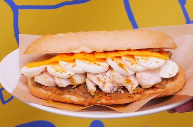 具材:塩麹バケット、無塩バター、有機野菜のベジタブルキーマカレー、チェダーチーズ、ゆで卵、低温調理した美桜鶏胸肉のスパイシーハムなど