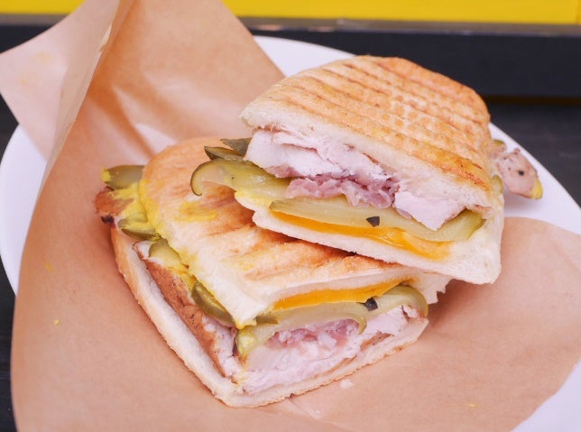 キューバンブレッドにローストポーク、ハム、マスタード、チーズ、ピクルスを挟み、バターを塗ってホットサンドでプレスした料理です。