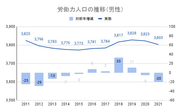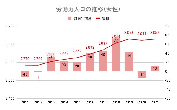 日本の労働者人口(15〜64歳の就業者数)は、2021年時点で平均5,755 万人と、前年に比べ16万人減少(2年連続の減少傾向)していますが、男女別にみると、男性は3,149万人、女性は2,606万人で、労働者人口比率は、男性は 86.7%と前年比0.2 ポイントの上昇に対し、女性は 73.3%と 0.7ポイント上昇しています。
