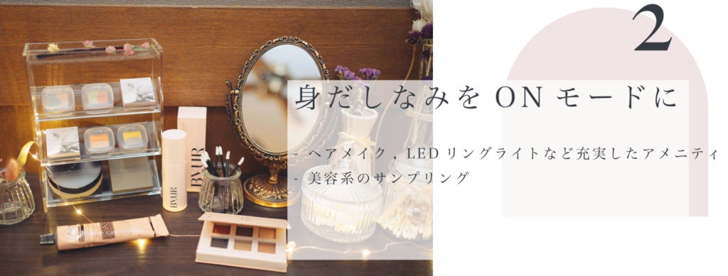 - 急な商談や会食前にも安心のメイクアップ用品やヘアアイロンなどのアメニティ