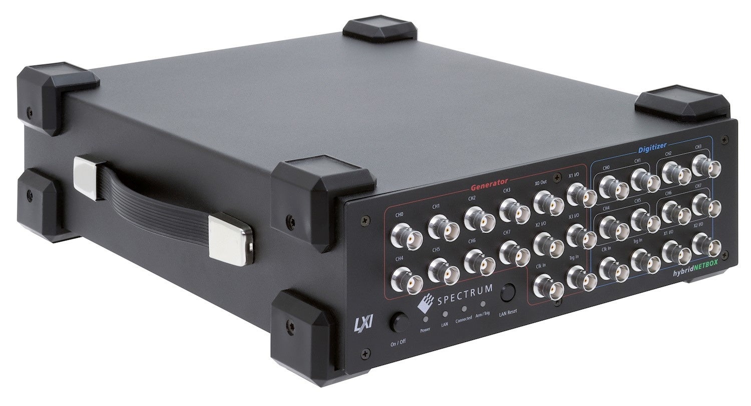 デジタイザなど計測機器を製造するスペクトラム・インスツルメンテ-ション社(本社ドイツ・グロースハンスドルフ / 以下、スペクトラム)は、マルチチャネル型の任意波形発生器(AWG)とデジタイザを1台のポータブルハウジングに収めた、画期的な測定プラットフォーム「hybridNETBOX」の提供を開始しています。信号の生成と取得を同時に行えるという他にない機能を備えたこの強力なツールは、刺激応答または閉ループ式の試験の用途に対して理想的な製品です。現時点では、2+2、4+4、8+8のチャネルを備え、サンプリングレートを40 MS/sから最大1.25 GS/sの範囲で選択できる、合計14種類のhybridNETBOXモデルを利用できます。