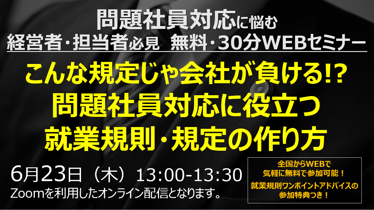 『こんな規定じゃ会社が負ける!? ~問題社員対応に役立つ就業規則・規定の作り方~』セミナーを6月23日(木)開催