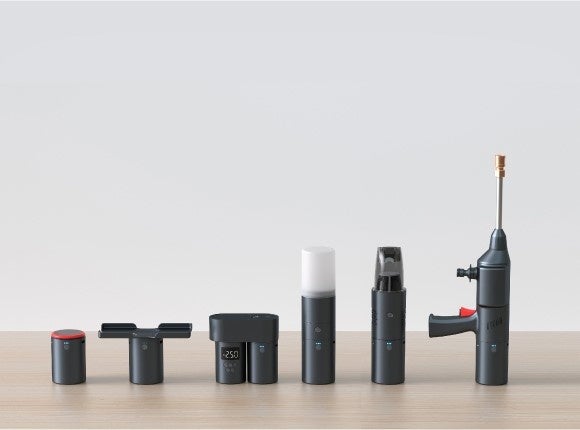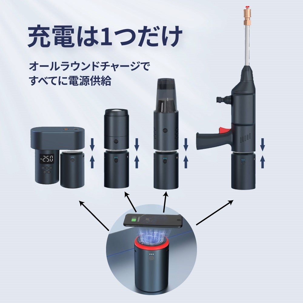 - オールラウンドチャージの先端を付け替えて、「高圧洗浄器」「エアコンプレッサー」「マルチLEDライト」「ハンディクリーナー」として使える!