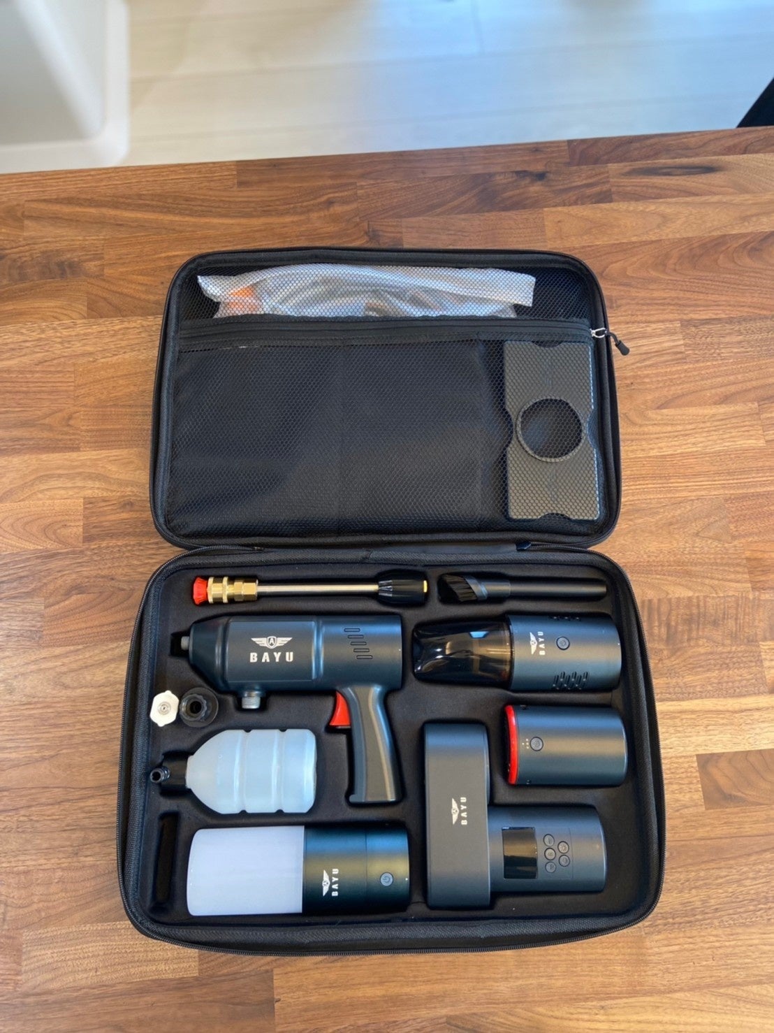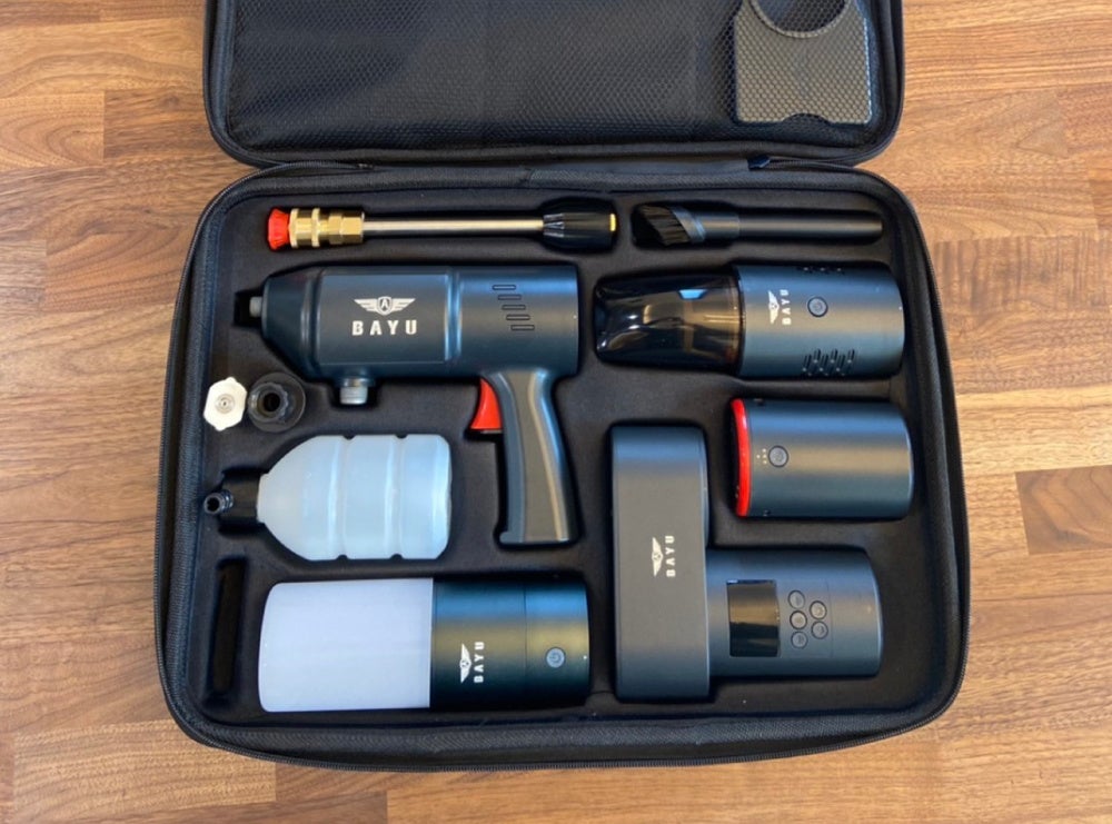 オールラウンドチャージ(モバイルバッテリー)の先端を付け替えて、「高圧洗浄器」「エアコンプレッサー」「マルチLEDライト」「ハンディクリーナー」としても使用できるワンバッグ車載セット。