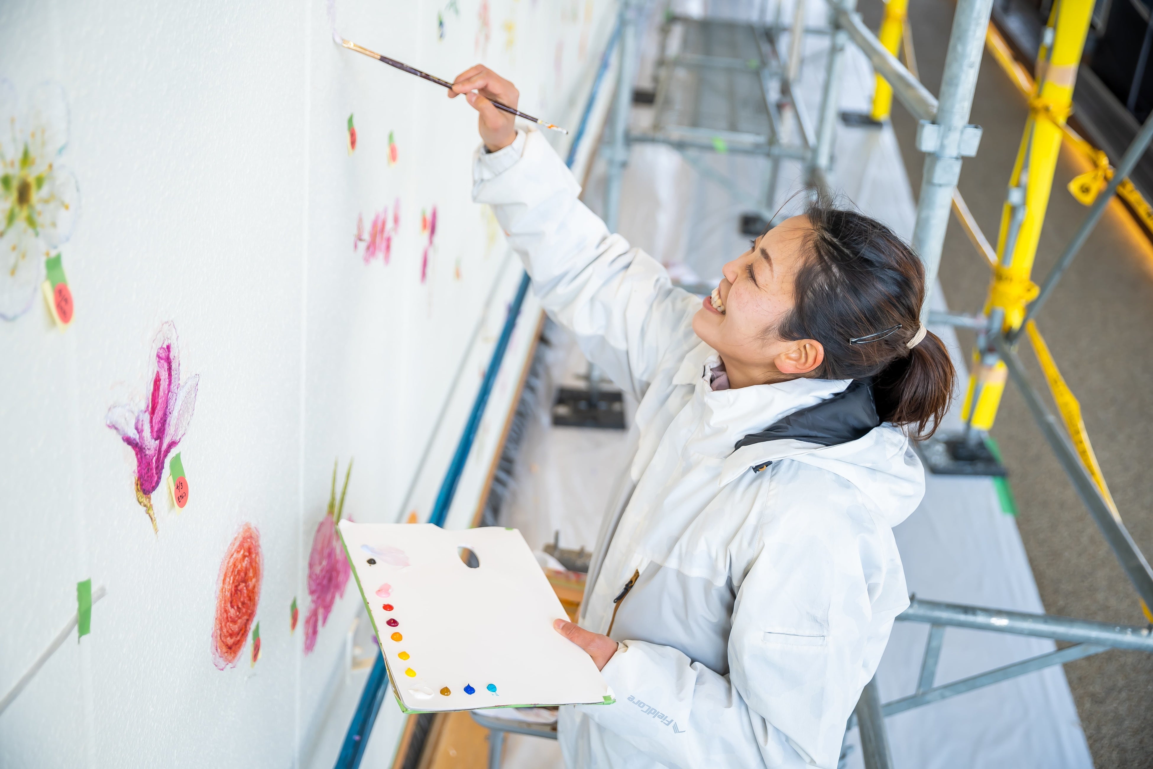 現在、原爆ドーム東隣に位置する「おりづるタワー」のスパイラルスロープ“散歩坂”にて、広島ゆかりのアーティスト9名(20代~90代)が1層ごとにライブペインティングを行っています。9層からなるスロープ上の壁のキャンバスは、約4m×24m。この大型キャンバスに、各アーティストたちは約2~3カ月の月日をかけ、ダイナミックに描きます。各世代のアーティスト9名の「願い」が、見る人の希望へとつながれていく、その一筆一筆を間近で見ることがきます。