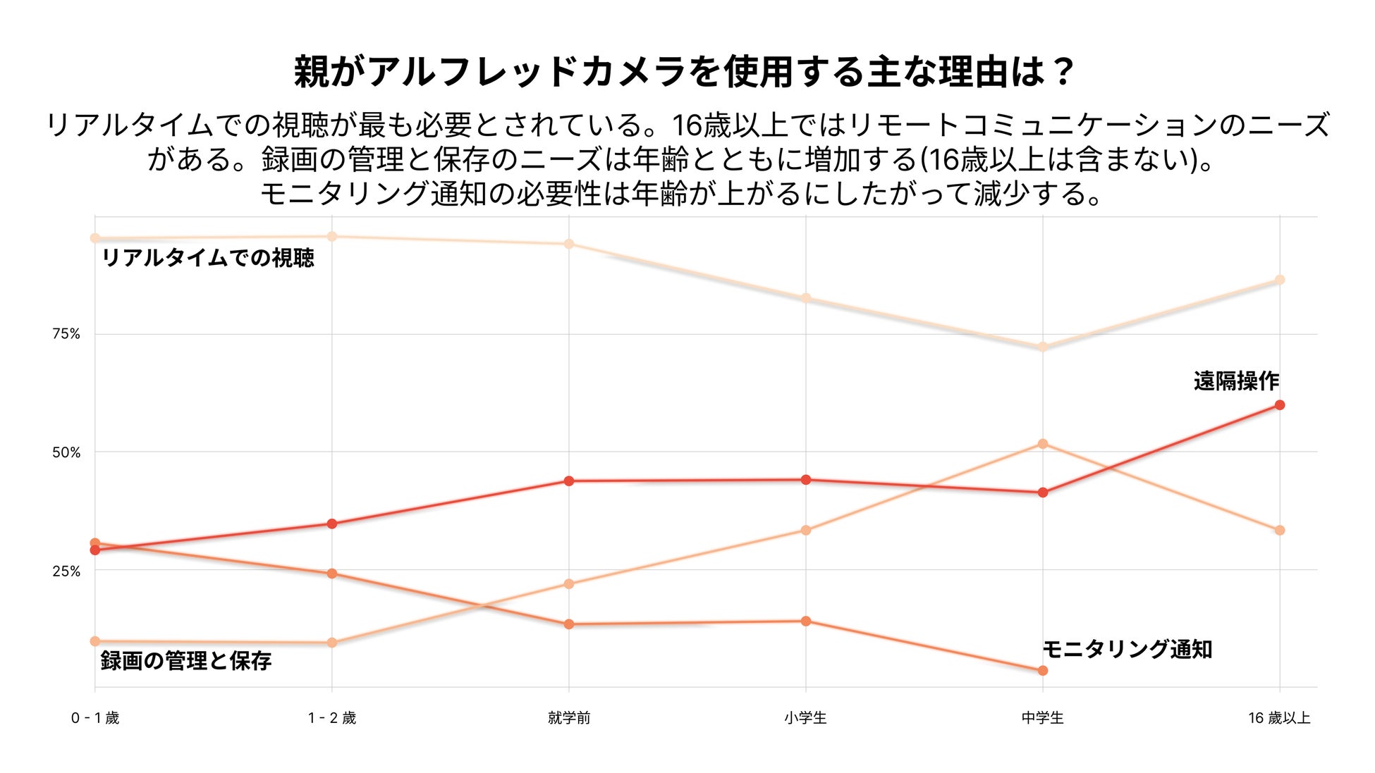 子どもが成長するにつれ、アルフレッドカメラを使う日本人保護者の用途も変化し、家での見守りから、外出時の自宅の状況確認(学齢期の子どもの世話)に用途が変化しています。調査結果から、ユーザーが期待する機能は、子どもの年齢や行動能力と密接に関係していることがわかります。