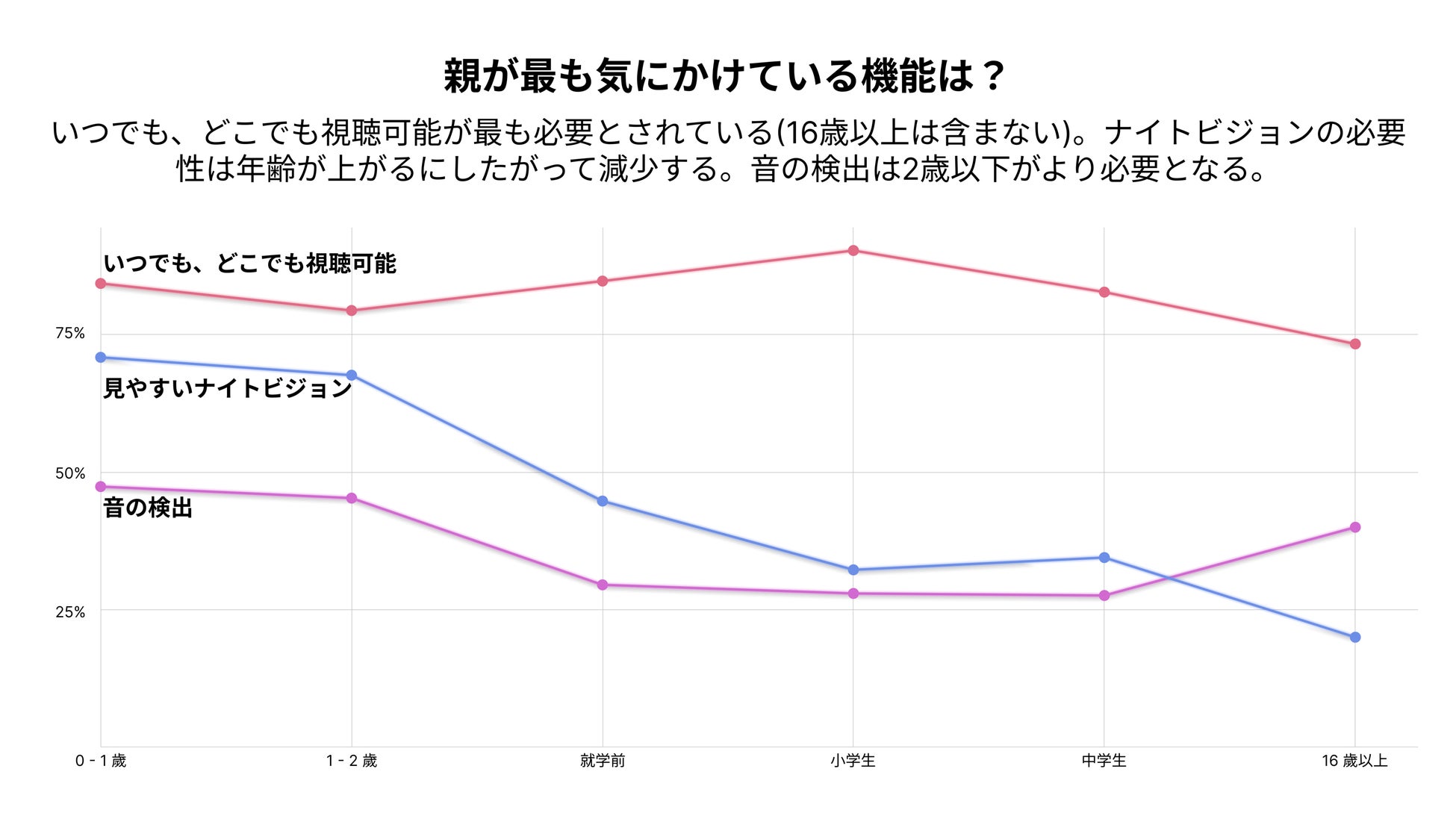 ナイトビジョンと音の検出は、赤ちゃんの見守りと関連性が高い2つの機能です。こちらは2歳以下の子を持つ親だけが抱くニーズですが、子供の年齢に関係なくリアルタイムの視聴は保護者が最も必要とする機能です。