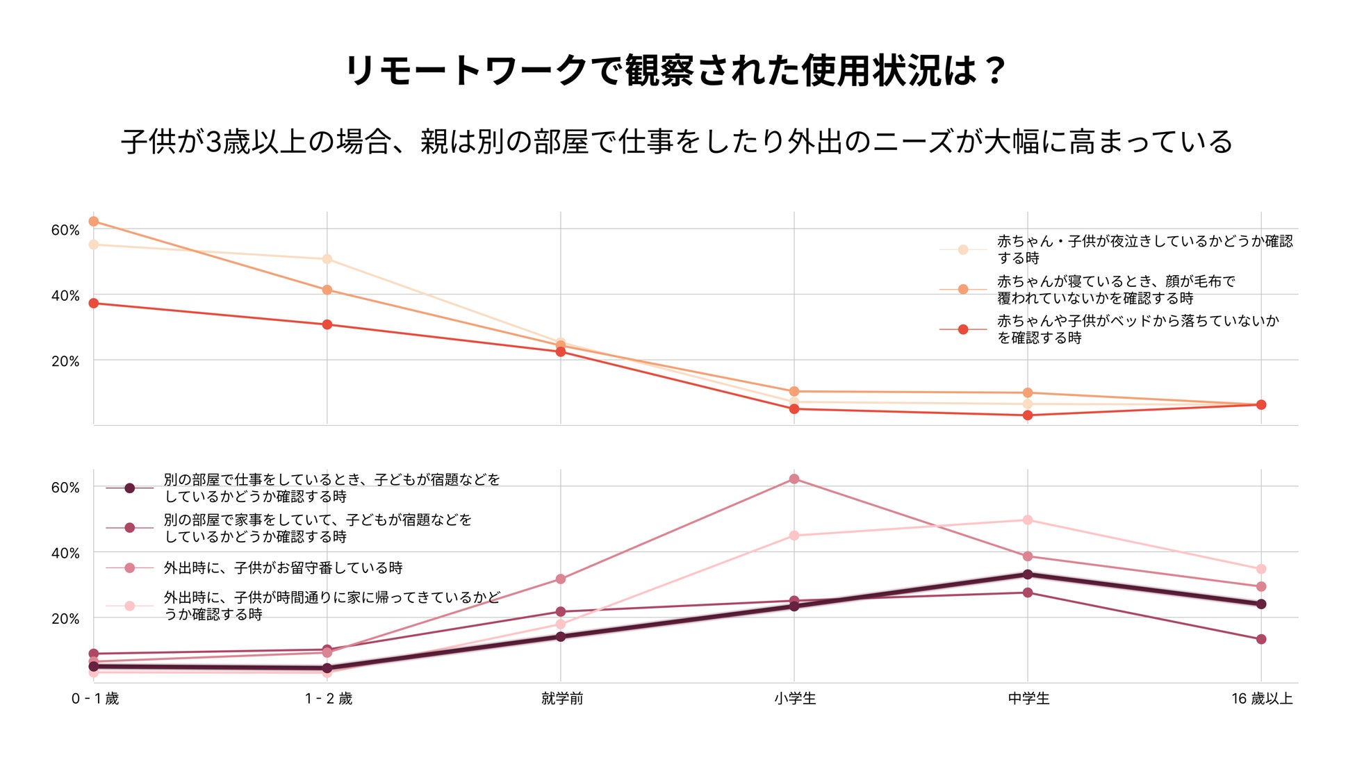 16歳以上の子供を持つ親は、リモートでのコミュニケーション需要が大幅に高くなっています。乳児の時期は、動体検知などの通知を必要としますが、年齢が上がるにしたがって徐々にモニタリング通知の必要性は減少します。