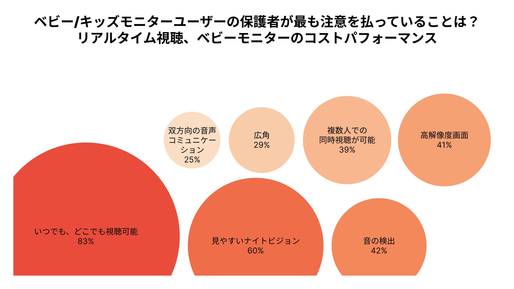 ベビー/キッズモニターに必要な機能を尋ねると、「いつでもどこでも見ることできる」が83%でトップとなり、次に「見やすいナイトビジョン」(60%)、「音の検出」(42%)、「高解像度画面」(41%)と続きます。これらの4つの機能はすべて、モニターを通して赤ちゃんまたは子供の状態をリアルタイムで表示したいという親の願望を反映しています。