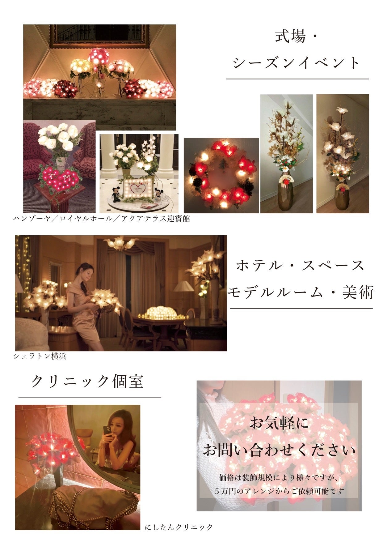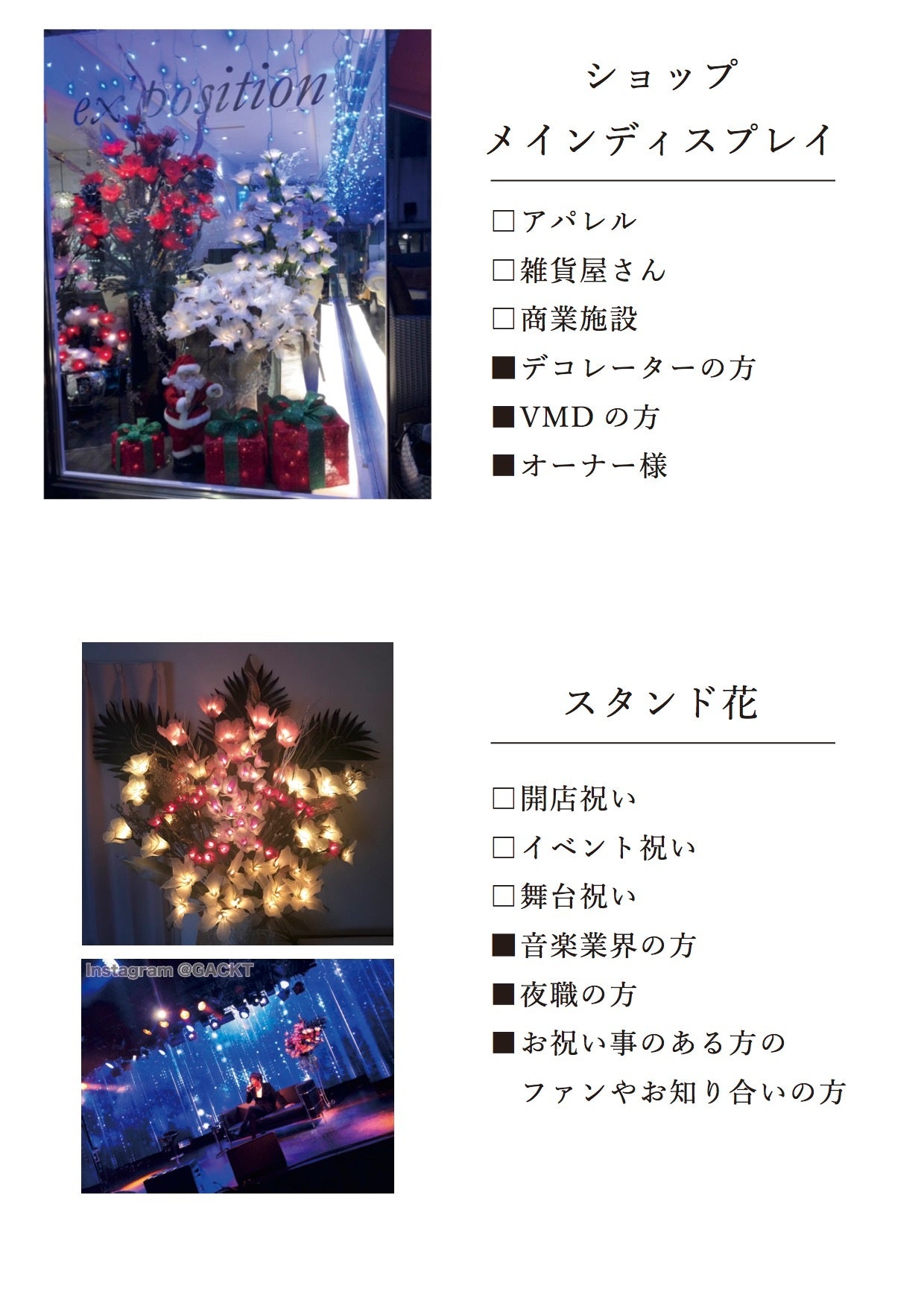 飲食店、クリニック、事務所、式場、舞台、番組美術、サロン、エントランス、スタンド花、等