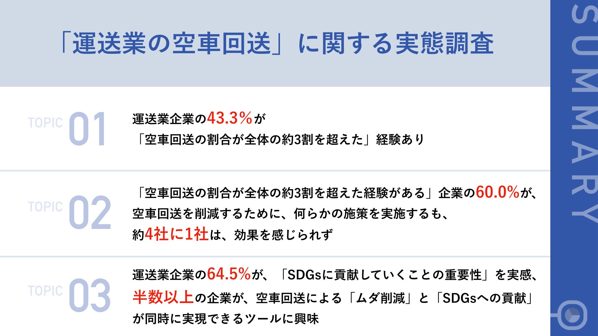 今回の調査では、運送業者にとって大きな課題となっている空車リスク解消のために、経営者たちが様々な施策を実施していることが明らかとなりました。しかし、効果を実感できていない場合も少なくないようです。また、SDGsへ貢献したいと考えている企業も多く、空車リスクの解消とSDGsへの貢献という二本柱で「空車回送」の削減に意欲的な様子を垣間見ることができました。今後、「空車回送の車両情報」を「空車を利用したいお客様」と共有するシステムが普及することによって、運送業界全体の活性化だけでなく、SDGsの貢献にも一翼を担うのではないでしょうか。