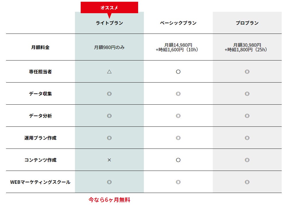 2022年11月30日までにお申込みの方を対象に、ライトプランの月額料金が半年間無料でお試しいただけるキャンペーンを実施しております。