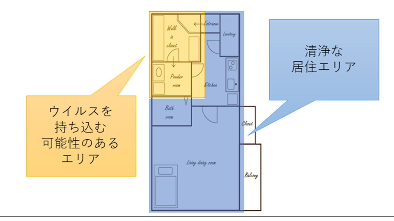 これからの時期は花粉が多くなり、花粉症の方にはつらい季節です。この動線ならウイルスと同じ仕組みで花粉を室内に持ち込みません。