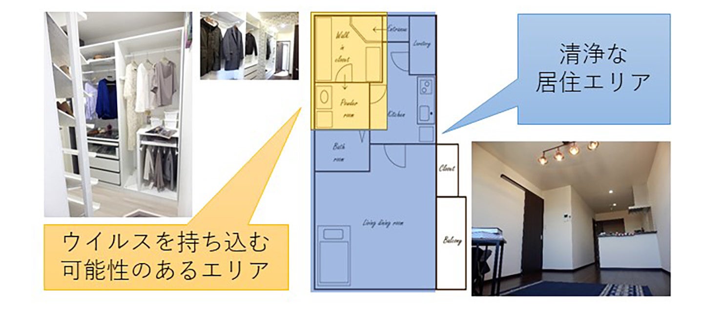 このアパート(名称:イルシオン野芥 所在:福岡市早良区野芥)は衣装部屋という間取り構成によりウイルスの侵入を防ぐ事が可能となり、withコロナ時代を見据えたレイアウトルームとなっています。