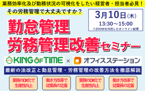 【先着30名】働き方改革及び定期的な法改正に対応するための『勤怠管理 労務管理改善セミナー』を3月10日(木)開催