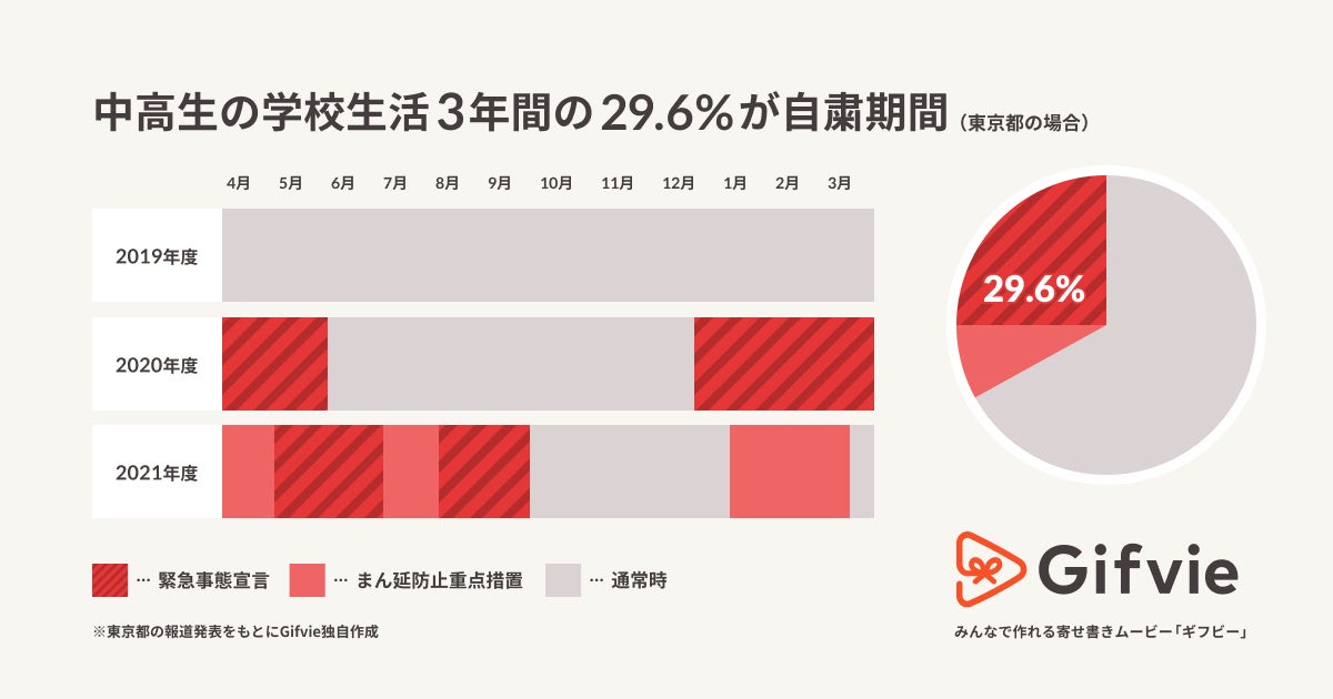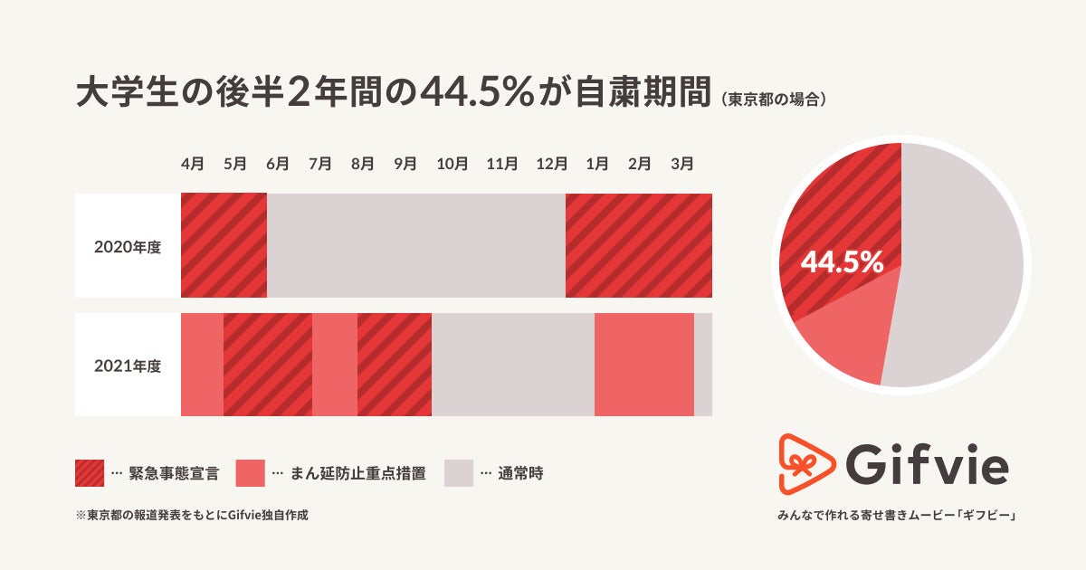 2022年2月16日時点で「まん延防止等重点措置」が、47都道府県のうち、36の地域で実施されています。それに伴い、今年度の卒業生の学生生活に占める自粛期間は、東京都の中学高校生で学生生活3年間のうち約30%、大学生では後半2年間の約45%を超えています。 ※東京都の報道発表をもとにGifvie独自作成