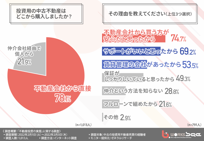 今回の調査で、投資用の中古不動産は、購入も売却も約8割が不動産会社を通しての売買であるという実態がわかりました。
