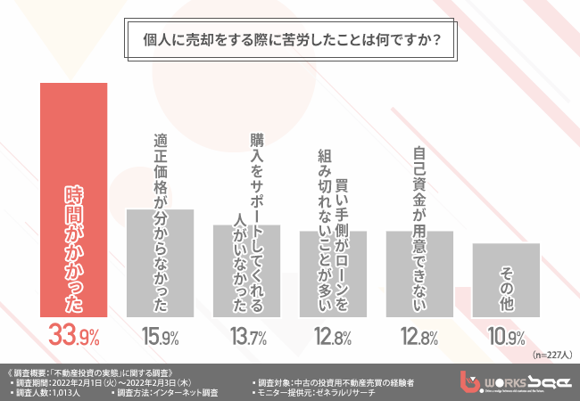「個人に売却する際に苦労したことは何ですか?」と質問したところ、3割の方が『時間がかかった(33.9%)』と回答しました。