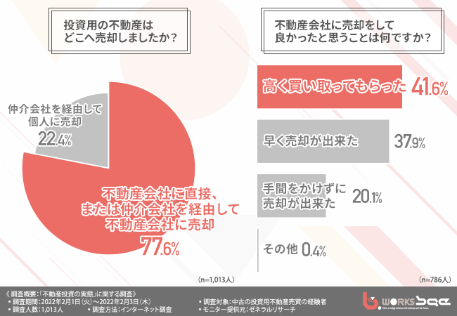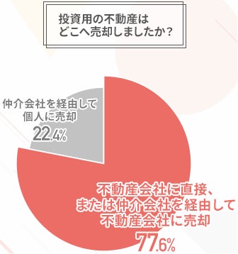 「投資用中古ワンルームマンションはどこへ売却しましたか?」と質問したところ、8割近くの方が『不動産会社に直接、または仲介会社を経由して不動産会社に売却(77.6%)』と回答しました。
