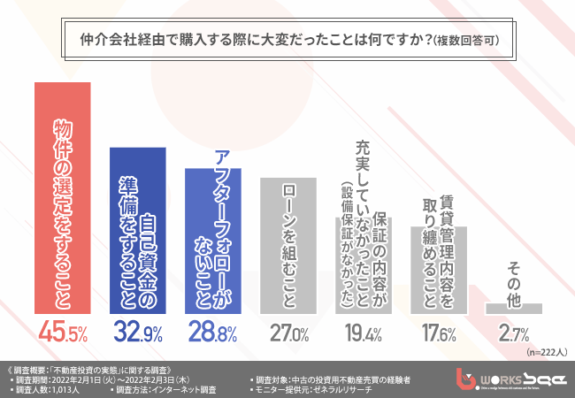 「仲介会社経由で購入する際に大変だったことは何ですか?(複数回答可)」と質問したところ、『物件の選定をすること(45.5%)』と回答した方が最も多く、次いで『自己資金の準備をすること(32.9%)』『アフターフォローがないこと(28.8%)』と続きました。
