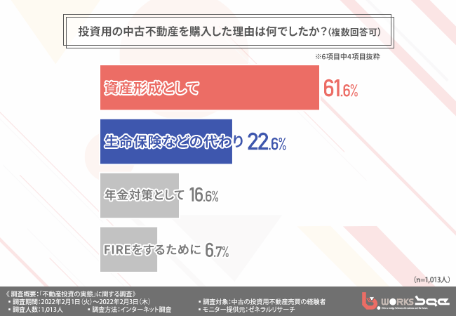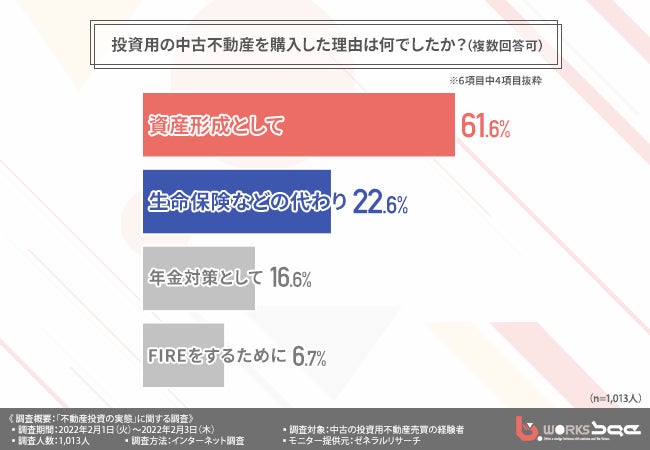 「投資用中古ワンルームマンションを購入した理由は何でしたか?(複数回答可)」と質問したところ、『資産形成として(61.6%)』と回答した方が最も多く、『生命保険などの代わり(22.6%)』『年金対策として(16.6%)』などの意見も多く見られました。