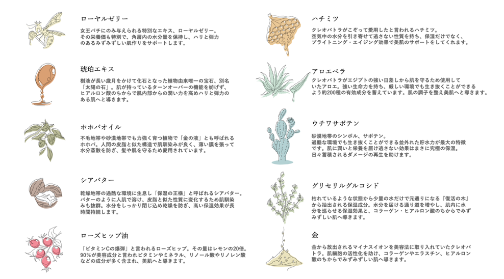 Cleo's Beautéではコンセプト成分として、クレオパトラが愛した植物成分や過酷な環境で育った生命力の強い10の成分を厳選し「Cleo's ESSENTIALS」として商品に配合しています。