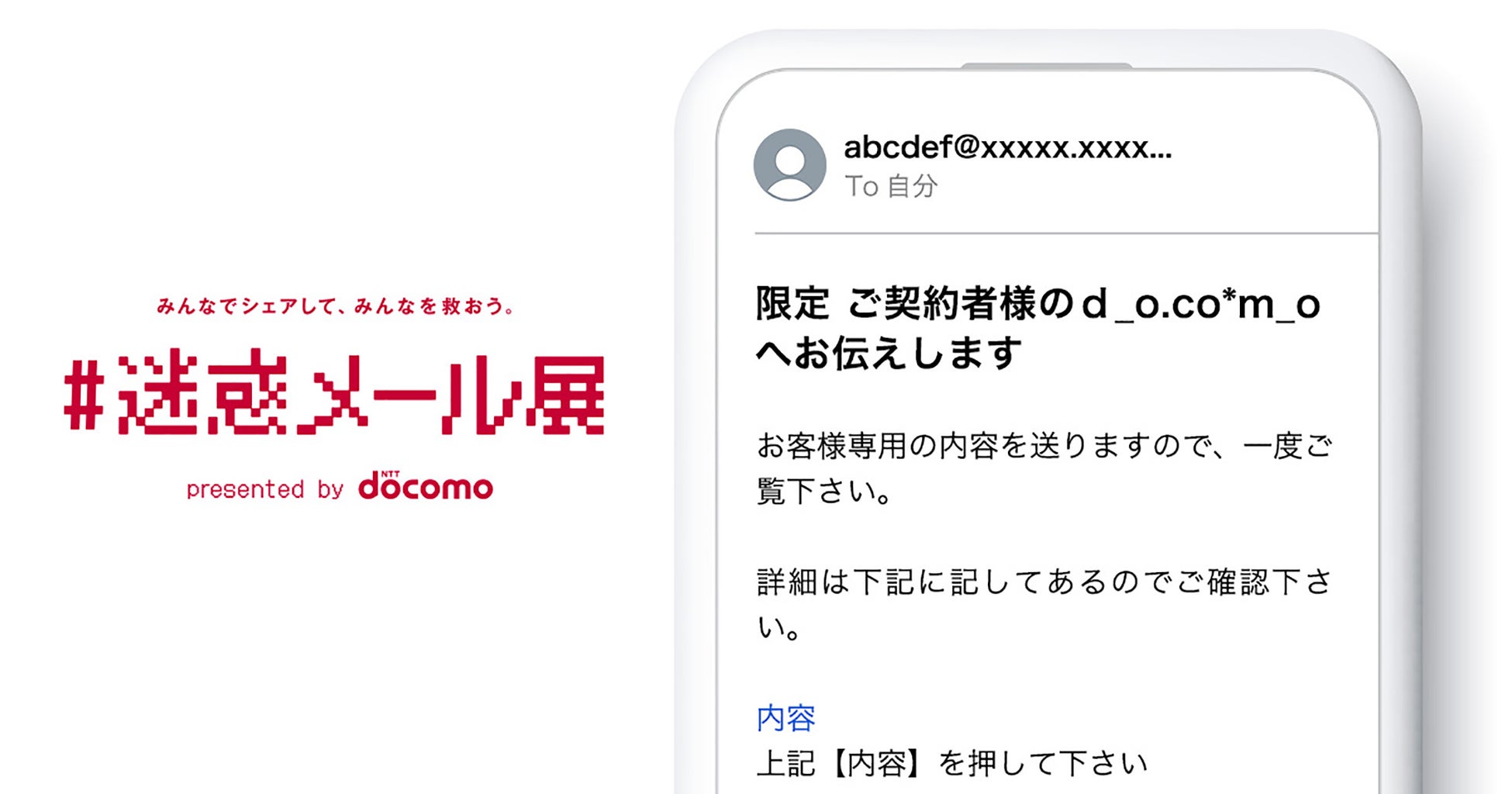 株式会社NTTドコモ(以下、ドコモ)は、内閣サイバーセキュリティセンター(NISC)が推進する「サイバーセキュリティ月間」の開催期間に合わせ、2022年2月15日(火)~3月18日(金)において、迷惑メールの現状や事例、対策を知ることで、疑わしいメールに対する知識を高め、被害を未然に防ぐことを目的に、「みんなでシェアして、みんなを救おう。#迷惑メール展」をオンライン上で開催いたします。