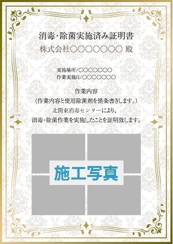 作業内容をご説明し、消毒・除菌済みステッカーをお渡しします。消毒・除菌済み証明書は、当日の消毒・除菌作業写真を添えて、後日郵送にてお届けします。