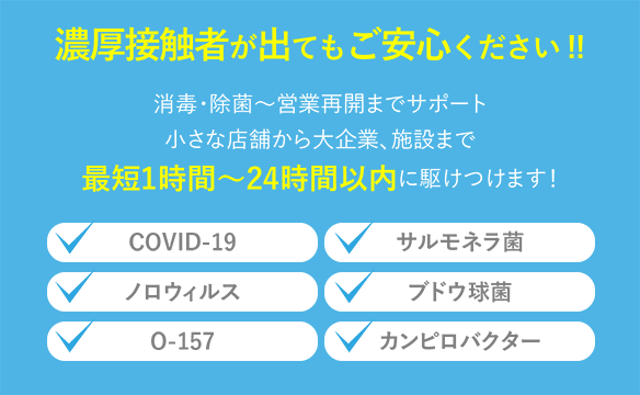 陽性者が確認され、直ぐにご連絡頂きました。翌朝から消毒作業を行い、次に日には従業員も通常通り、ご出社頂いております。素早いご決断が、会社を救います。お取引先の方にも安心して頂けること間違いありません。