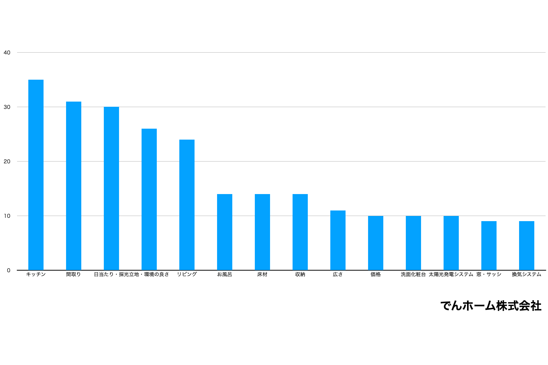 注文住宅といえば、その土地に合わせて、注文者の考え・価値観に合わせて間取りを変更できるのが良さのひとつということで、「間取り」が2位という結果でした。