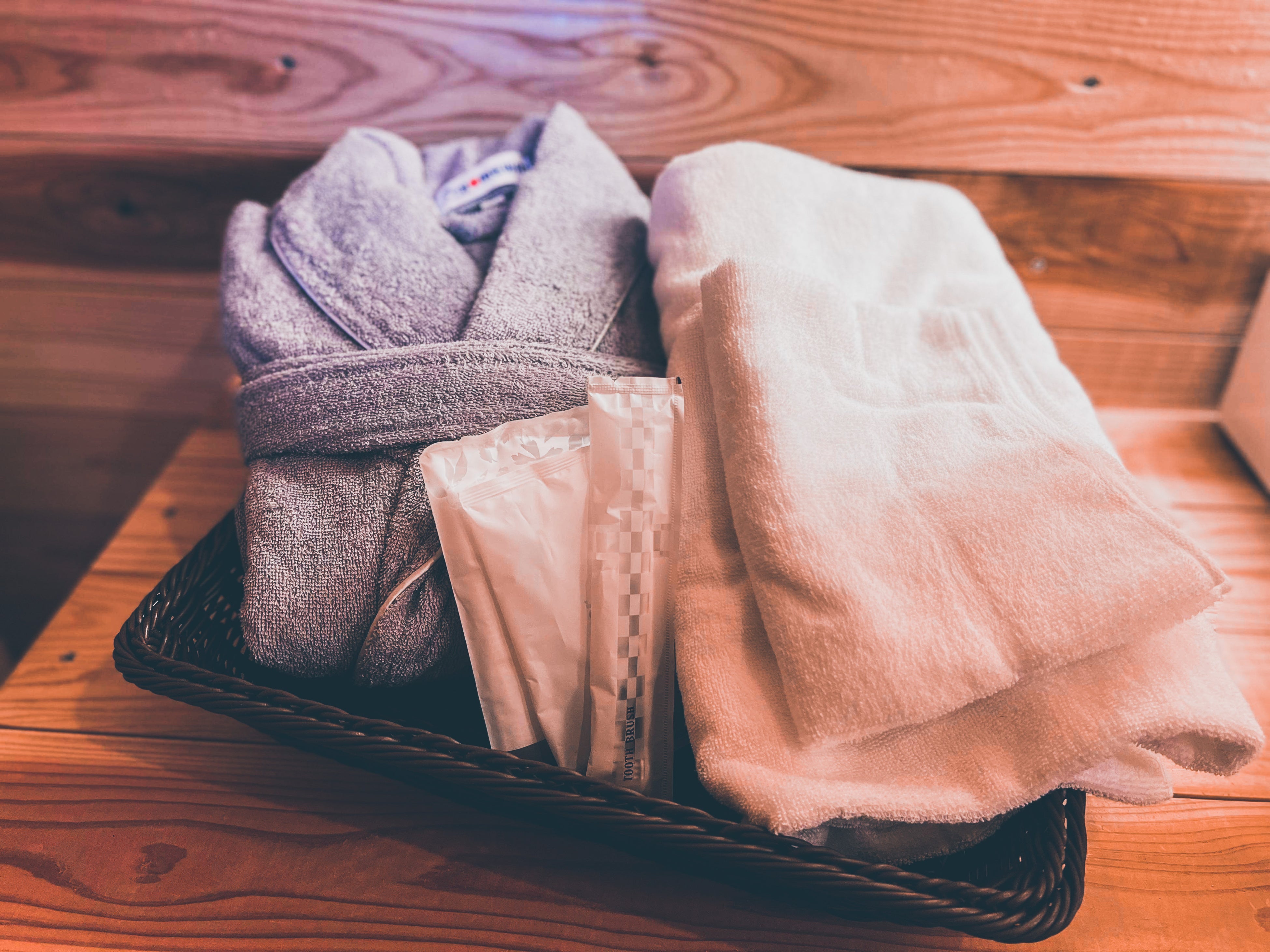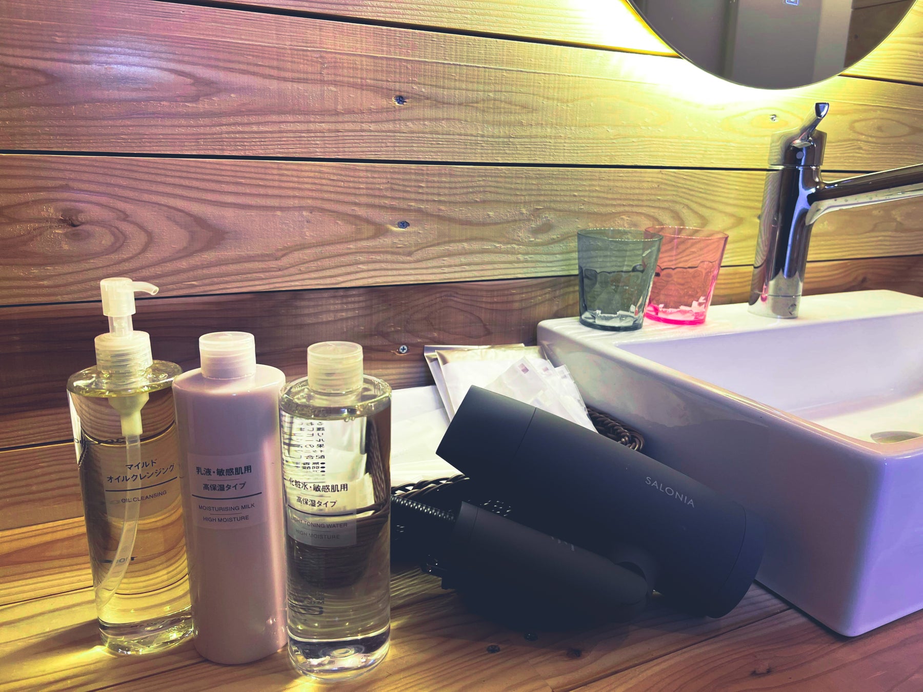 タオルや歯ブラシなど基本的なものはもちろん、浴室ドライヤーは、速乾性も高く、ヘアケア機能も備わっている「SALONIA」を採用。他にもバスローブや、女性に嬉しい無印良品の化粧水・乳液・オイルクレンジングなどのフェイスケア用品も備えてあるので、手ぶらで日帰りのお客様でも安心してご利用が可能です。