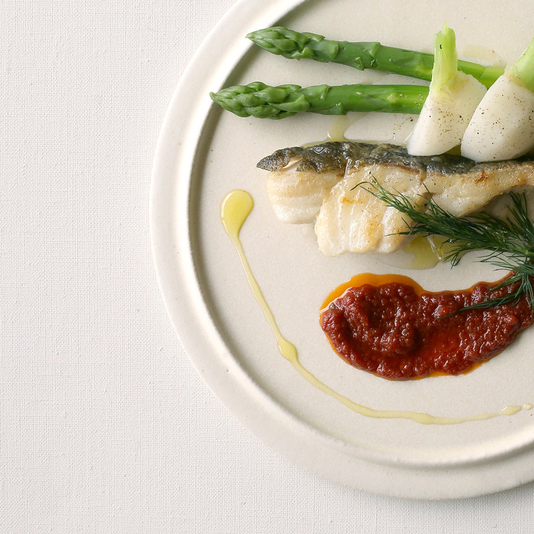 白身魚と季節の野菜。素材それぞれの繊細なニュアンスを楽しむレシピ。ハーブを細かくカットして、トマトソースをお皿に敷く直前に加えるのもおすすめです。