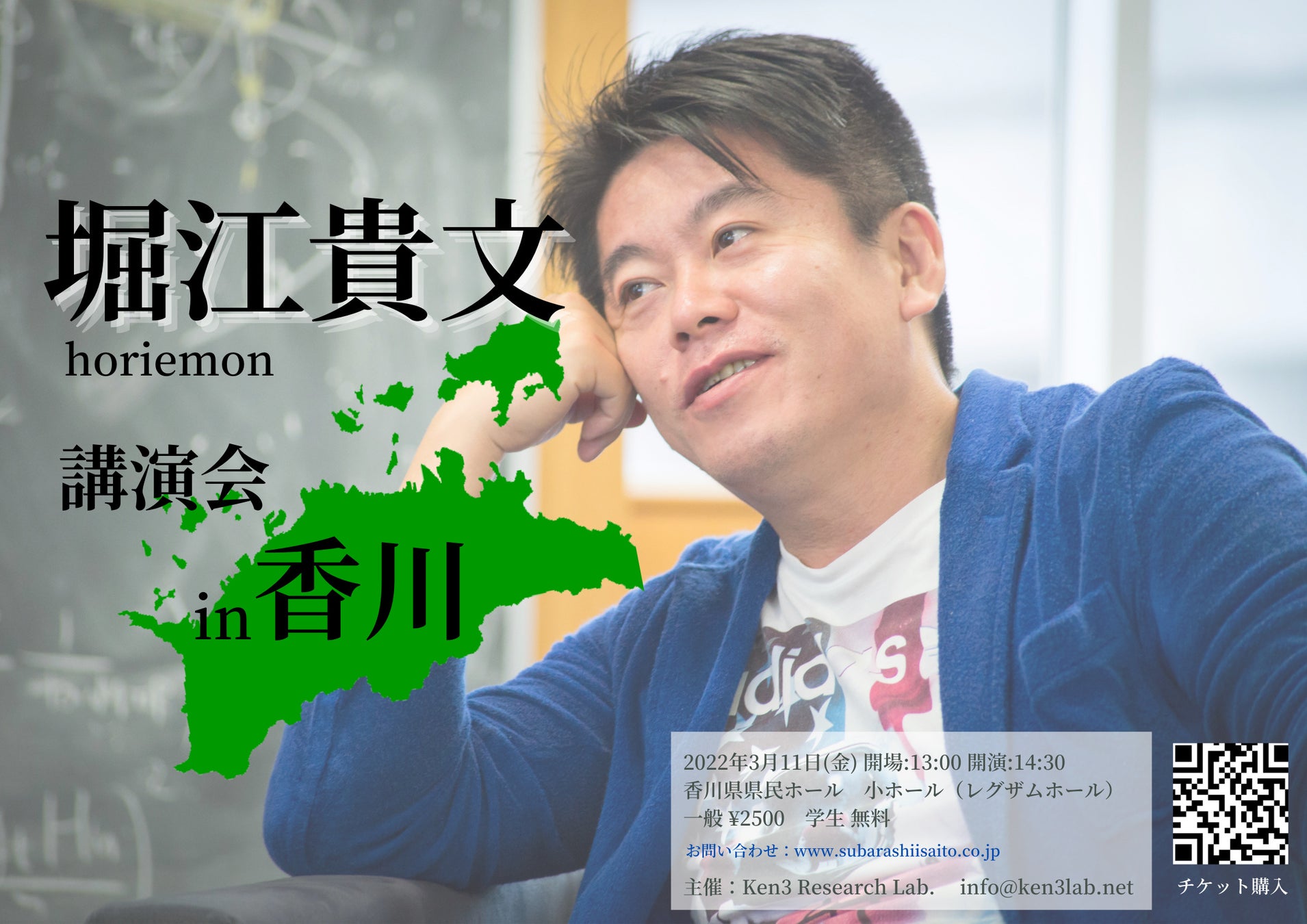 堀江貴文講演会in 香川・実行委員会(責任者:野田健一)は、実業家ホリエモンこと堀江貴文による地方ビジネスのあり方や取り組み方についての講演会を2022年3月11日に開催いたします。