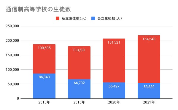 私立通信制高校の生徒数においては、2010年と2021年を比較すると63%増加しています。