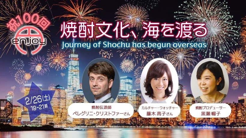 記念すべき100回は、アメリカに独自の方法で焼酎を広めている焼酎伝道師で焼酎輸出会社「HONKAKU」創設者のペレグリニ・クリストファー氏、アメリカと日本の文化の橋渡しをしているカルチャーウォッチャーの藤木高子氏をお迎えして2月26日(土)に開催いたします。
