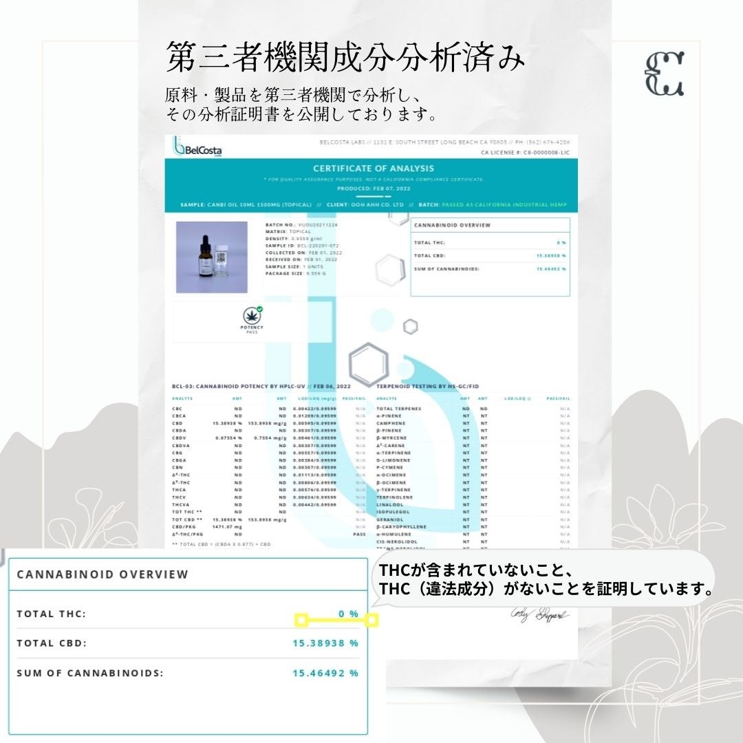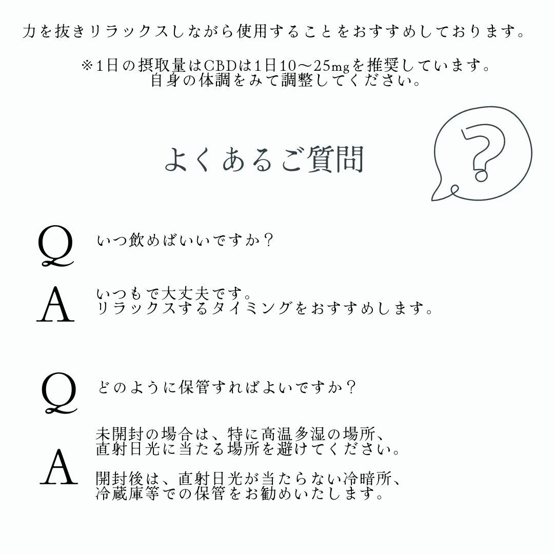 本製品に使用されているCBDは、厚生労働省が定める基準をすべてクリアし、品質を守る遮光塗装瓶や農薬不使用、遺伝子組み換え不使用など、成分の安全に配慮されたものを使用しています。