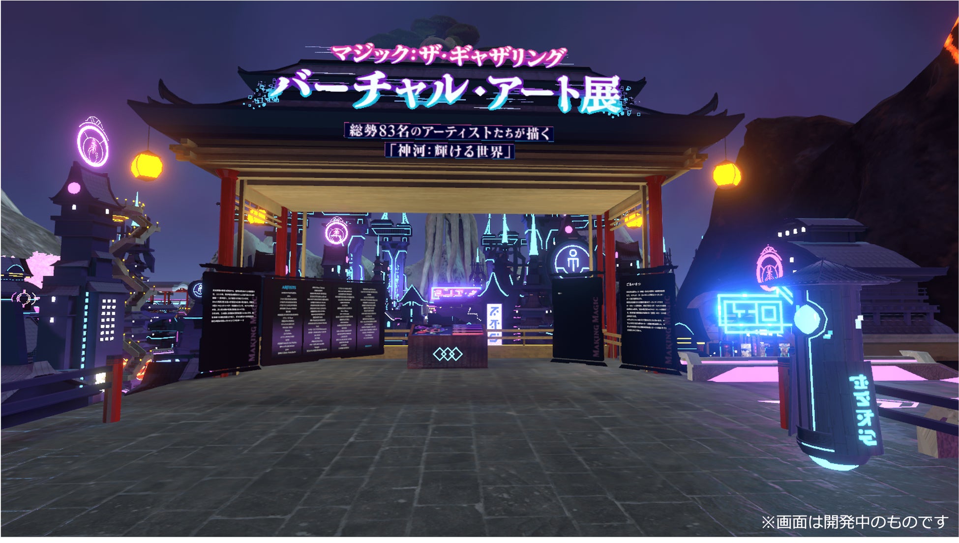 本プロジェクトでは新セット『神河:輝ける世界』の舞台であるサイバーパンクな街「都和市」をVR空間に再現。セットに収録される数々の素晴らしいアートを、アーティスト⾃⾝の解説付きで鑑賞できるバーチャルなアート展を開催します。