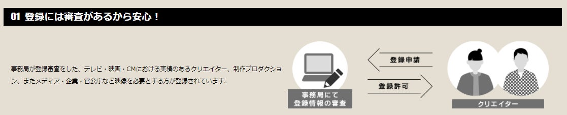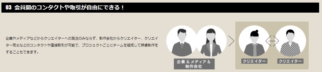 企業やメディアがテレビ・映画・CMの制作経験のある、厳選されたプロの映像クリエイターと直接取引できるマッチングサイトです。
