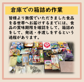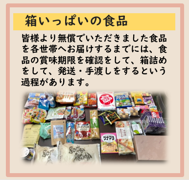 10,000円の支援で4世帯へ、5,000円の支援で2世帯へ、1箱約13kgのたくさんの食品をお届けできます。